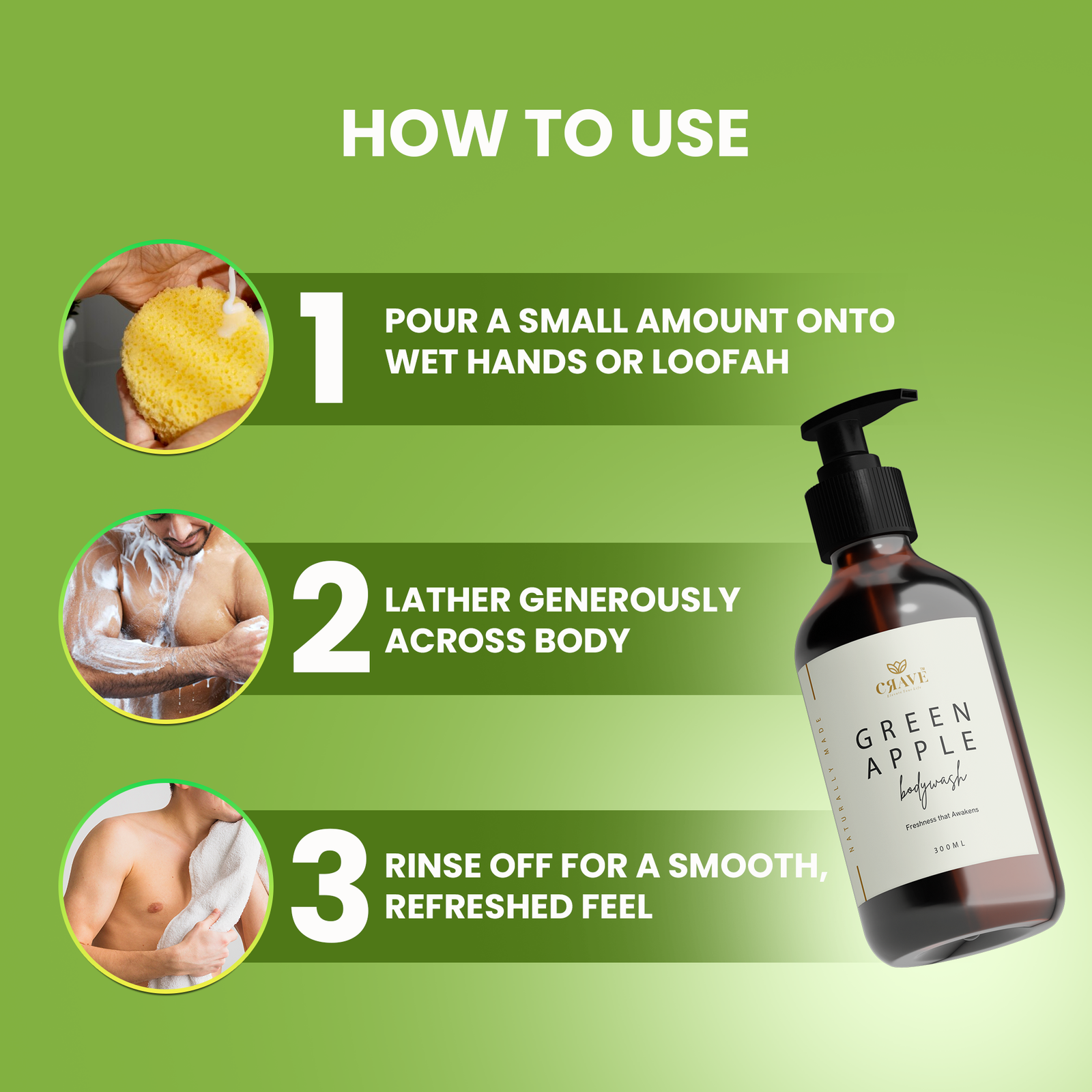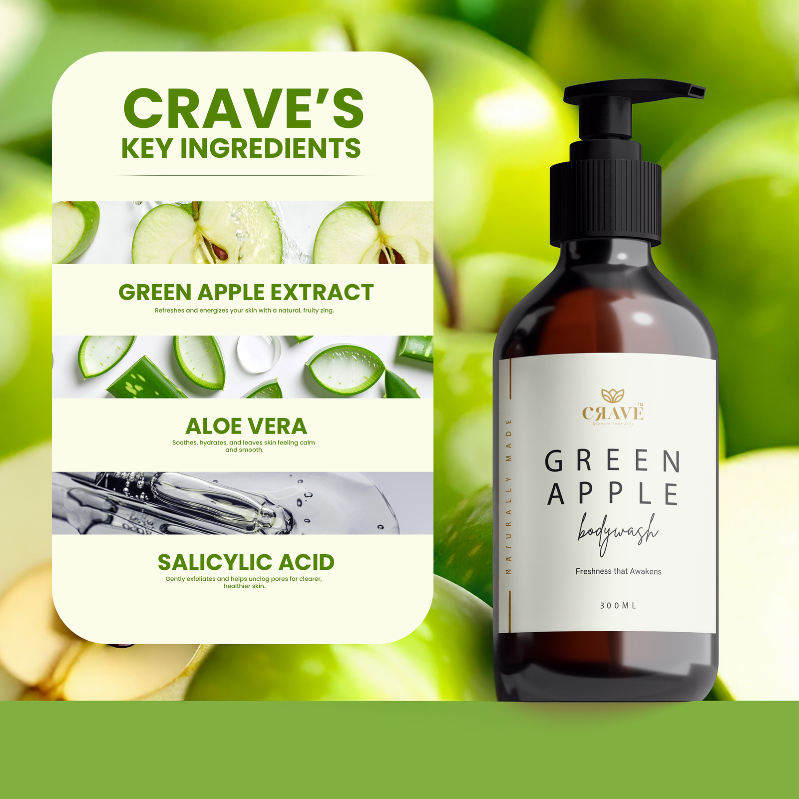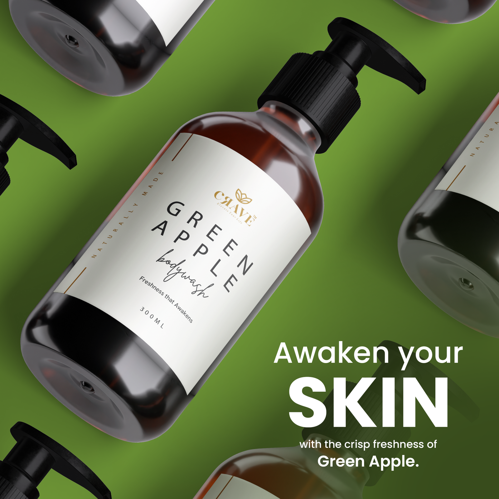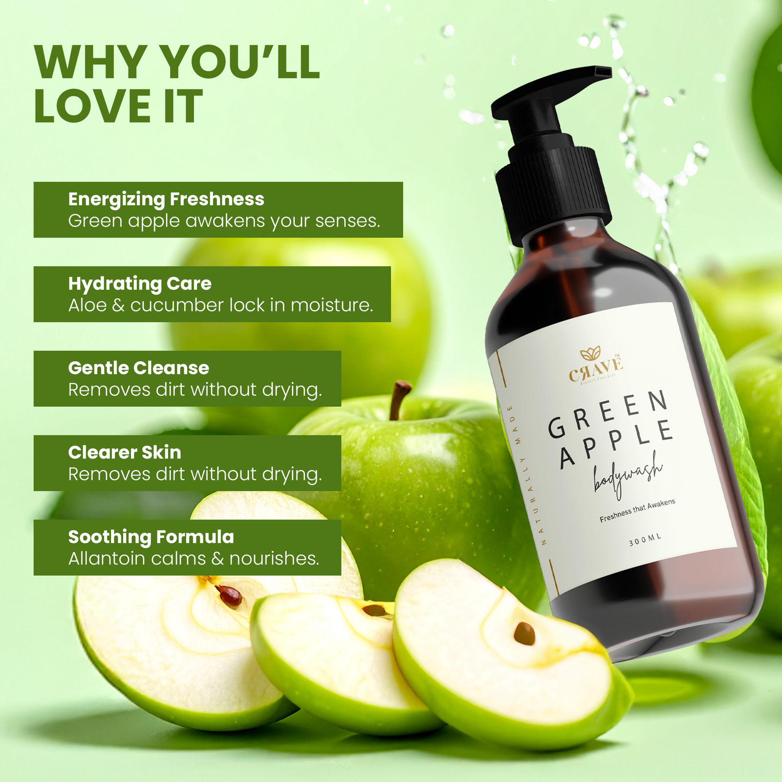 Crave Green Apple Body Wash | Enriched with Aloe Vera, Apple & Cucumber Extracts | Refreshing & Nourishing Formula for All Skin Types – 300ml