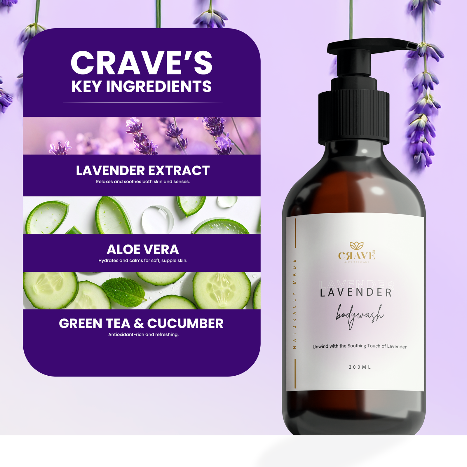 Crave Lavender Body Wash | Calming & Hydrating Cleanser with Aloe Vera, Green Tea Extracts | Soothes Skin & Relaxes Senses – 300ml